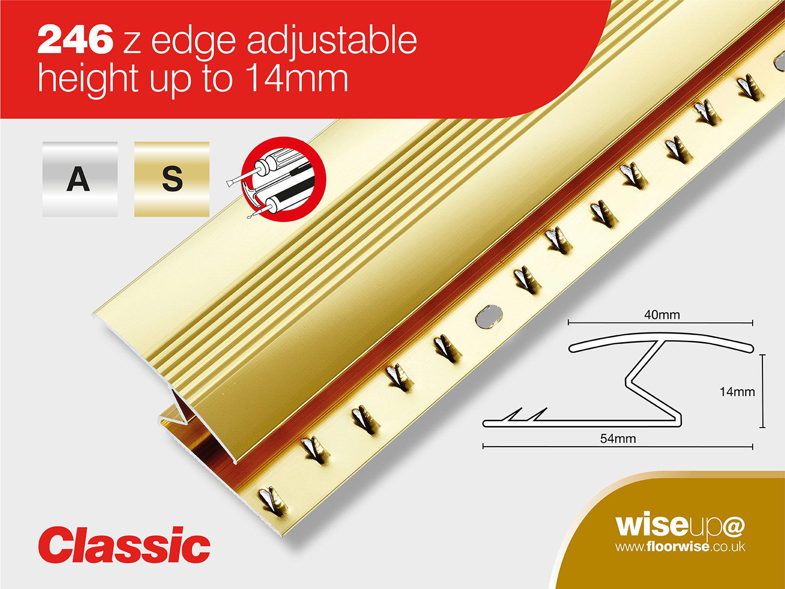 This highly polished section is versatile and can be used to join carpets with a variety of floor coverings. The top can be adjusted to accommodate surfaces of different heights up to 15mm.