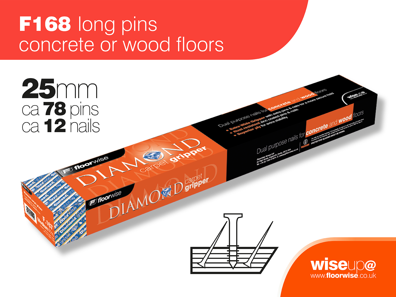 F168 – Diamond Dual Purpose Carpet Gripper Pre-nailed for Concrete and Wooden Floors, Long Pin