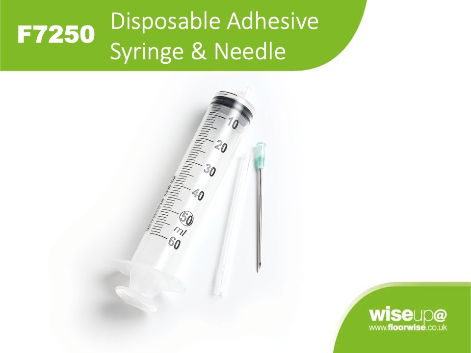 This syringe comes complete with needle and is used for injecting adhesive into air pockets under floor coverings.